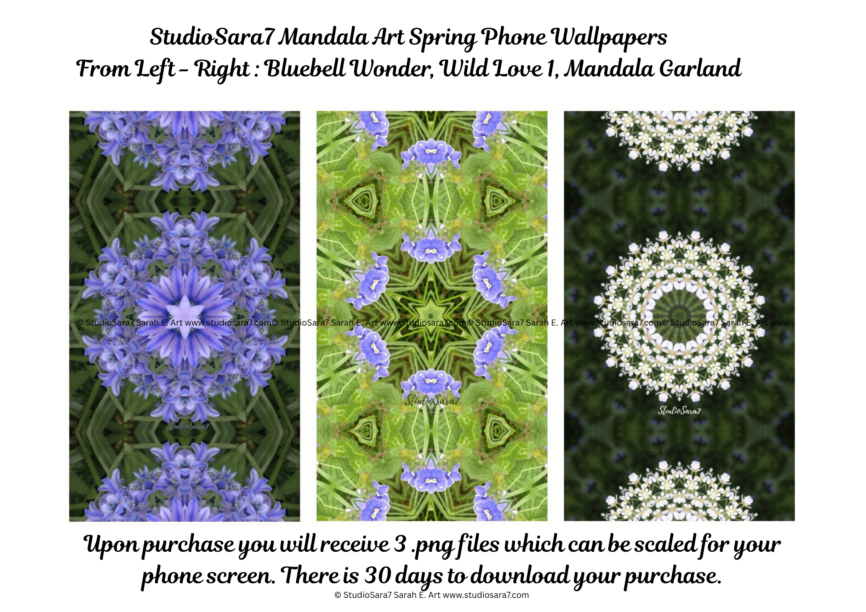 Dive into the wonder-filled beauty of Spring flowers with 3 interchangeable phone wallpapers from my Spring & Wild Love range. Choose from the richness of Bluebell Wonder, the captivating blue and green of Wild Love 1 and the delicate white flowers of Mandala Garland. Each phone wallpaper has been scaled to fit your phone screen,…