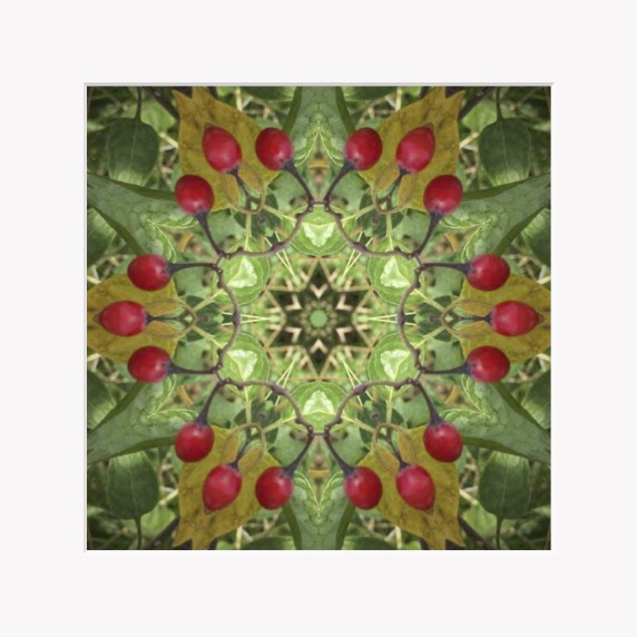 The warmth of the red berries and green leaves, the central six pointed star representing balance and unity, celebrating the Winter Solstice. Created from my photography of local Scottish nature, each art piece reflects the harmony in my daily meetings with nature.